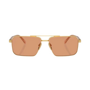 The Prada SPR A57 (PR A57S) 5AK‑07V is a modern pilot/rectangle aviator frame in polished gold-tone metal with vivid orange-tinted lenses. Striking and expressive, it delivers high-contrast visual impact with Prada’s minimalist architecture.