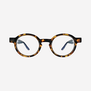 This is a handcrafted, circular frame featuring round lenses and an arched bridge. Made in France from authentic Italian acetate, it showcases a distinctive blue tortoise shell pattern. The contrasting acetate around the lenses adds a modern twist to this classic design. Each frame includes a microfiber pouch, a hardshell case, and a signature Thierry Lasry box.