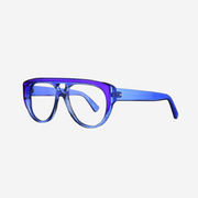 This is a bold aviator-style frame handcrafted in France from high-quality acrylic. Despite its chunky appearance, the frame is lightweight and comfortable. Available in various vibrant colors, including "Blue Moon," a striking blue hue. The frame measures 53mm in lens width, 16mm in bridge width, and 145mm in temple length.