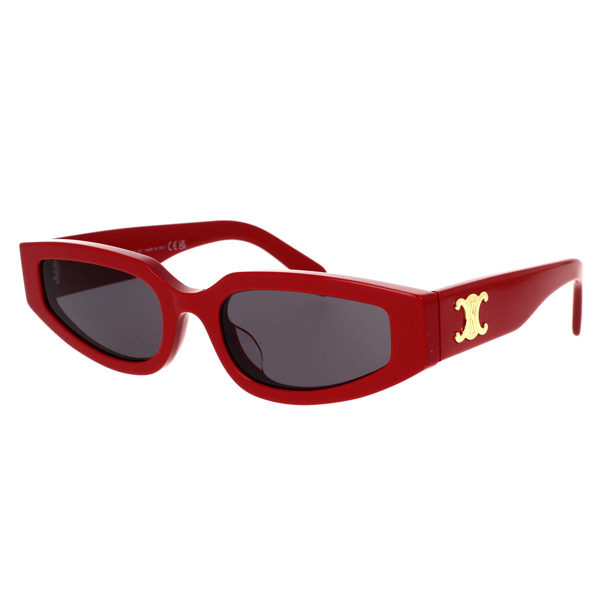 The CELINE CL40269U 66A Triomphe Geometric Sunglasses are a striking accessory that combines bold design with luxury craftsmanship. Featuring a vibrant red acetate frame (color code 66A) and smoke grey lenses, these sunglasses are part of CELINE's Triomphe collection, known for its distinctive geometric shapes and the iconic Triomphe logo on the temples.